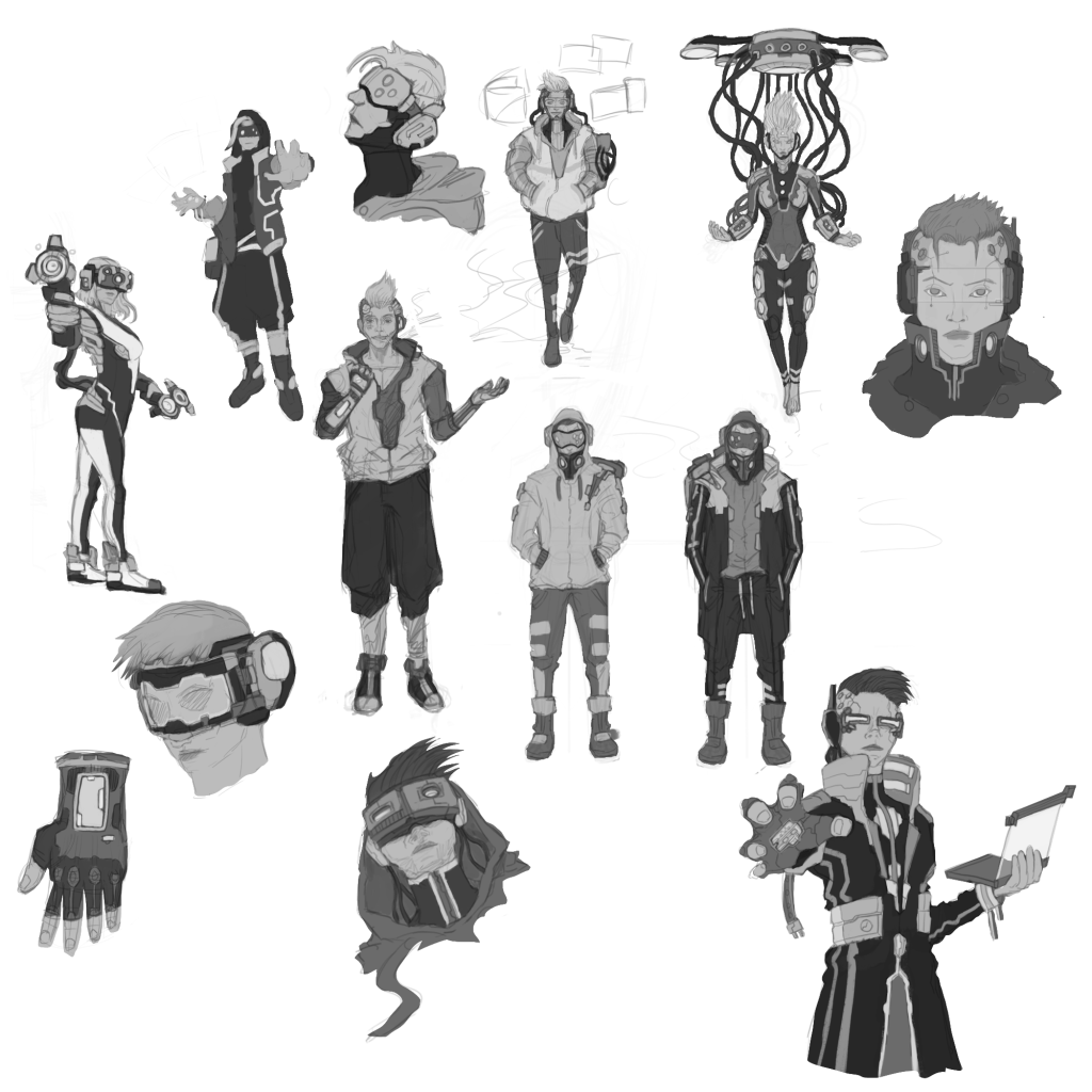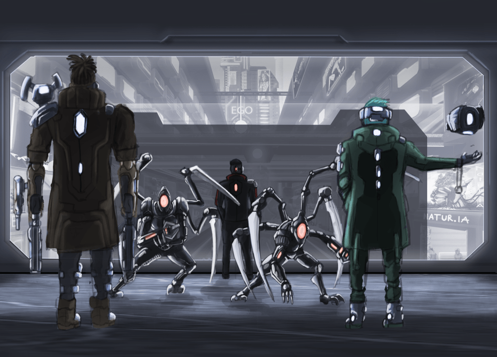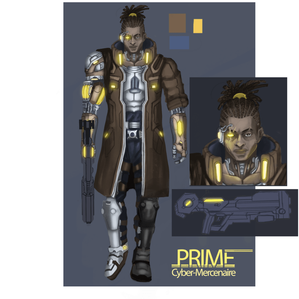 Mission : Conceptualiser trois personnages emblématiques d’un univers cyberpunk : un hacker rebelle, un mercenaire cybernétique et un politicien corrompu – et deux environnements contrastés : un quartier technologique high-tech et une zone industrielle abandonnée, en mettant en avant leur style, leur équipement et l’atmosphère oppressante de la mégapole futuriste et réaliser une illustration réunissant toutes ces conceptualisations.
