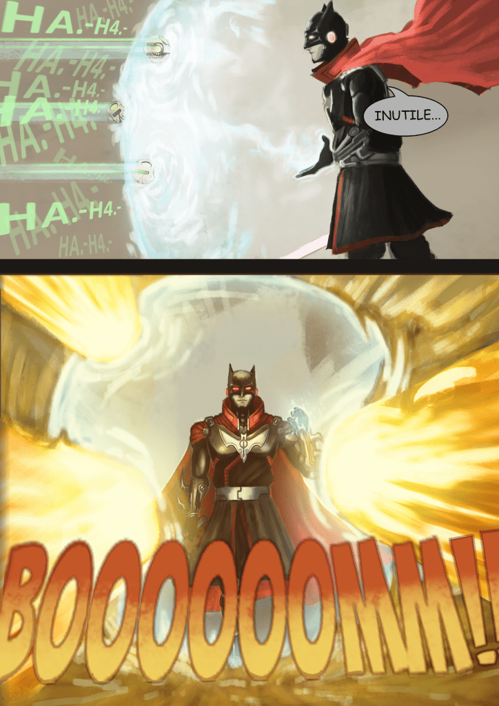 Mise en place de la pose et des proportions, définition de de l’ambiance colorimétrique générale ( ici le Vert ), travail des effets et texture et ajustement finaux, effets spéciaux pour un rendu plus dynamique.